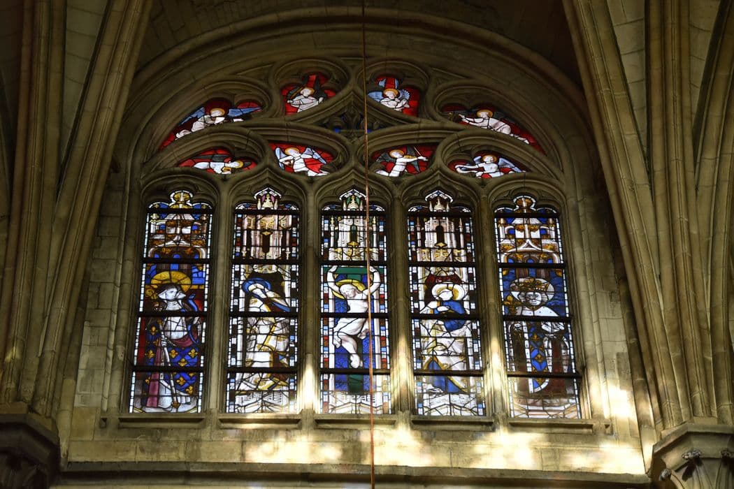 Verrière à personnages (baie 114) : Sainte Isebergue ; Vierge ; Crucifixion ; Saint Jean ; Saint Louis