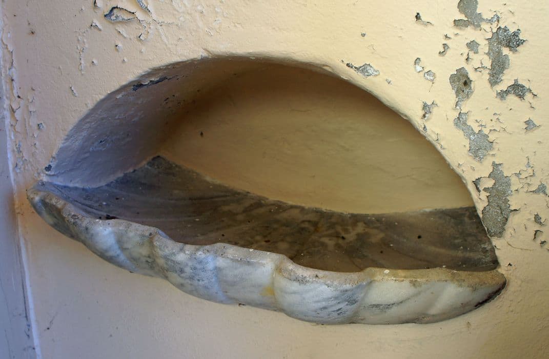 Bénitier en forme de coquille en marbre blanc, encastré dans le mur nord du porche.
