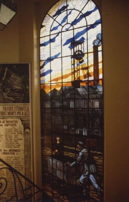 deux verrières de l'escalier d'honneur : Mineurs travaillant au fond et Vue de la cour de la fosse n°5 de Bruay
