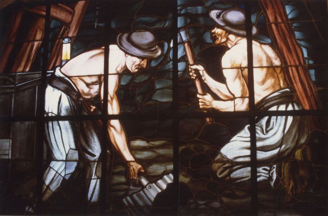 POP | Plateforme ouverte du patrimoinedeux verrières de l'escalier d'honneur : Mineurs travaillant au fond et Vue de la cour de la fosse n°5 de Bruay
