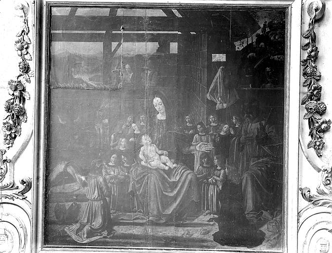 Tableau exécuté pour Gilbert de Bourbon Montpensier, qui acheva le palais d'Aigueperse et qui épousa en 1480 Claire de Gonzague, fille de Frédéric de Gonzague, marquis de Mantoue, patron de Mantegna. Ce tableau se trouvait dans la sainte chapelle d'Aigueperse et échappa ainsi à l'incendie qui ravagea le palais au milieu du 16e siècle. La commande en 1490 d'une Nativité à Benedetto Ghirlandaio, que l'on sait en France entre 1486 et 1493, illustre bien le goût italianisant de la cour d'Aigueperse.