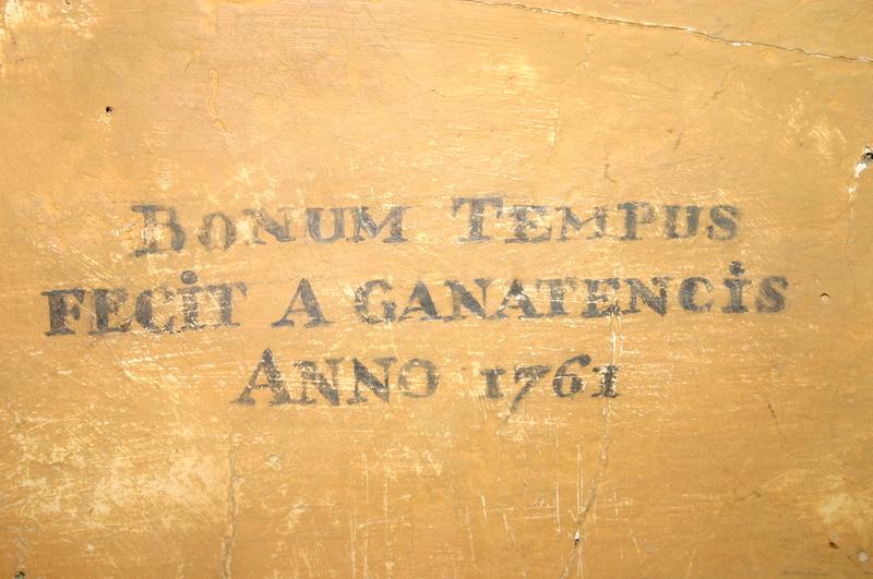 inscription et date peintes sur le dossier du siège : BONUM TEMPVS FECIT A GANATENCIS Anno 1761.