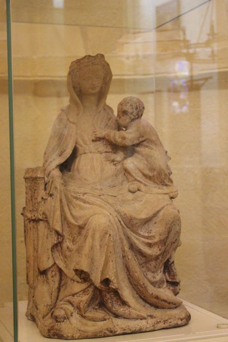 'Assise sur un trône architecturé, Marie allaite un Enfant Jésus dont l'attitude remuante contraste avec sa sérénité. Le geste précieux par lequel la jeune mère étire l'étoffe de son manteau est fréquent dans les effigies mariales du Gothique international, que la Vierge soit debout (Vierge de l'ancienne coll. Dormeuil) ou assise (Vierge de Cleveland).' (B. Chancel-Bardelot)