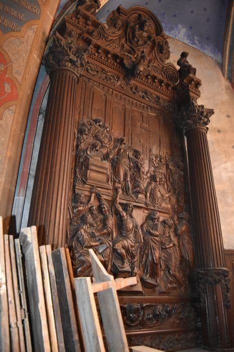 retable des fonts baptismaux, bas-relief : Pentecôte (la)