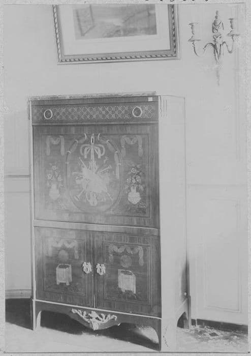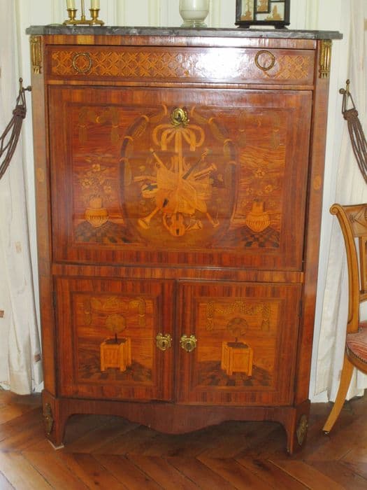 bois : marqueterie ; bronze : ciselé, doré ; marbre