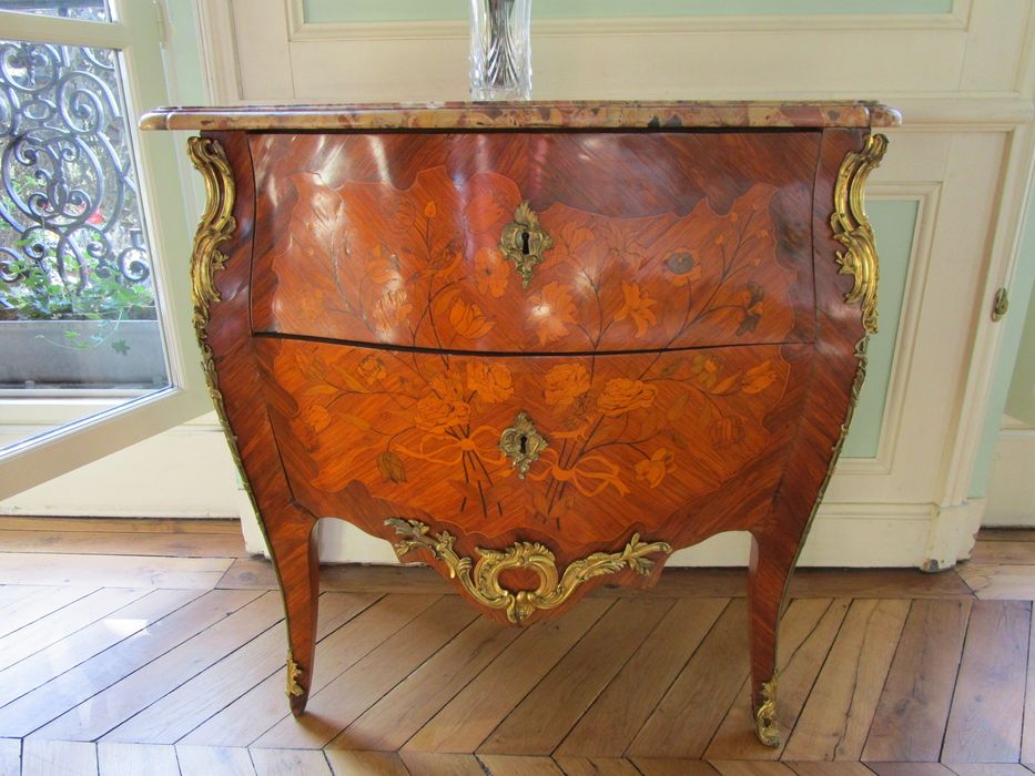 Epoque Louis XV. Cette commode faisait partie du mobilier de l'hôtel de Charles Antoine Claude de Chazerat, dernier intendant d'Auvergne (1775-1789). Cet hôtel fût acheté avec ses meubles par l'Etat en 1844, pour servir de palais épiscopal affectation qu''il a gardé jusqu'en 1905.