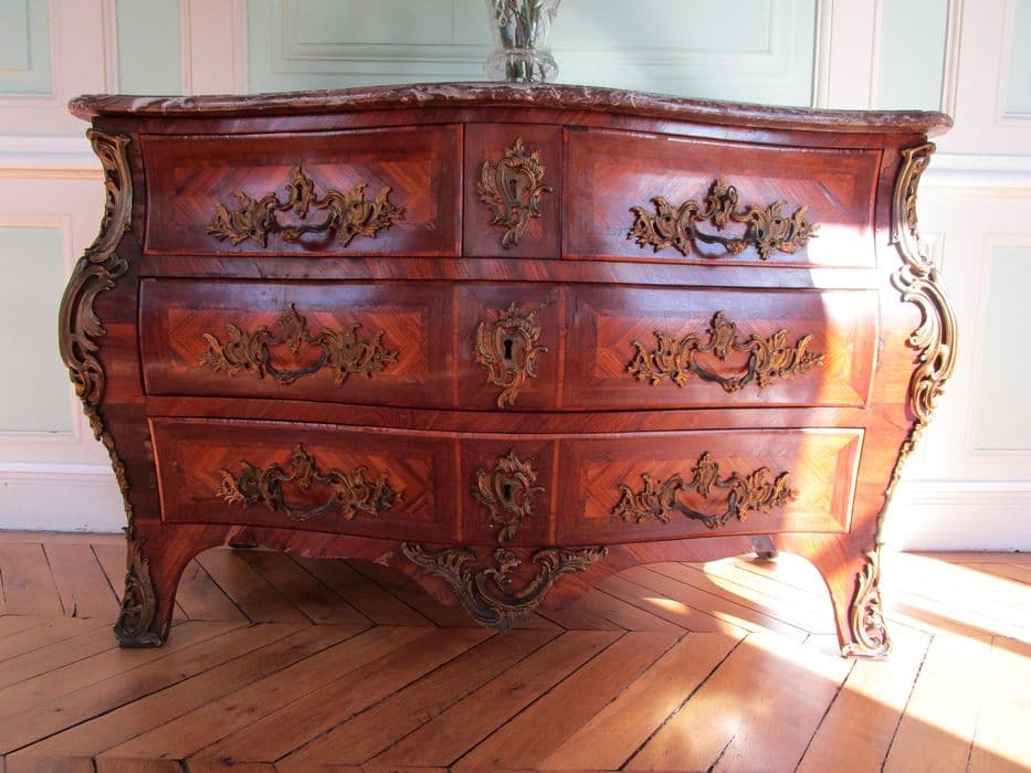 A quatre tiroirs avec tablette de marbre rouge griotte moucheté de blanc.