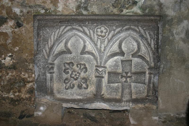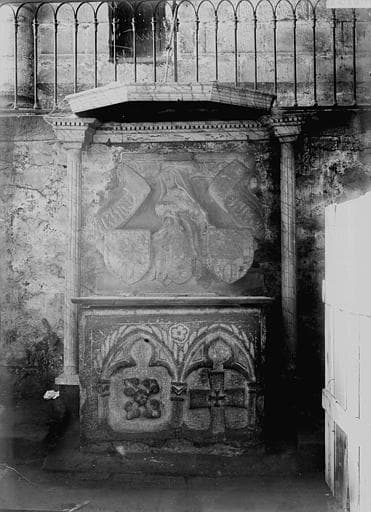 La face principale est formée d'un bas-relief présentant deux arcatures ogivales trilobées contenant l'une à gauche un décor de quatre fleurons, l'autre à droite une croix. Au fronton entre deux arcades une marguerite.