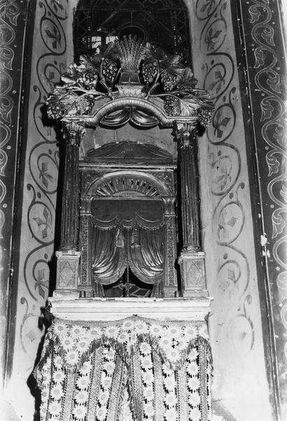 Une exposition surmonte le tabernacle. Curieuse composition associant : un portique dont les colonnes cannelées surmontées de chapiteaux portent un fronton cintré dont le centre est occupé par une gerbe de blé et les côtés par des sarments de vigne chargés de raisins. Un second portique est placé à l'intérieur du premier dont les pilastres décorés en leur centre de rinceaux porant une architrave découpée d'un cintre surbaissé et un fronton en forme de coupole très aplatie. Le centre du portique est garni d'un rideau ouvrant en deux parties relevées latéralement par des embrasses.