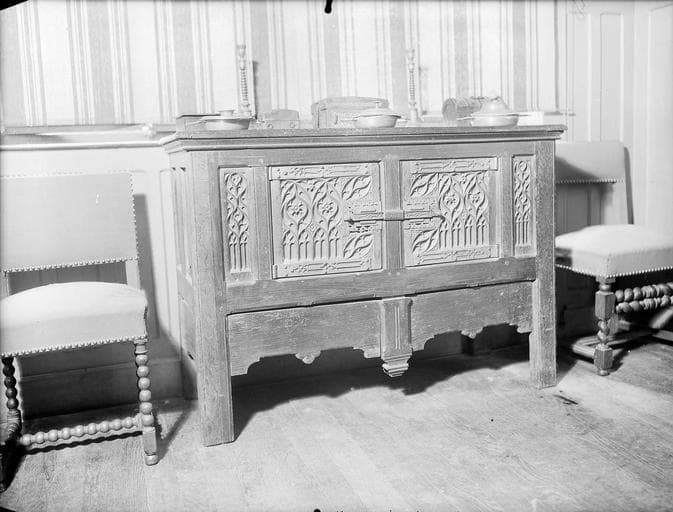 L'un à couvercle cintré en les deux autres en bois et fer époque gothique (petit coffret avec grilles disparu). Trois écuelles à couvercle en étain. Un coffret avec monogramme bois sculpté époque Louis XIV Louis XV.