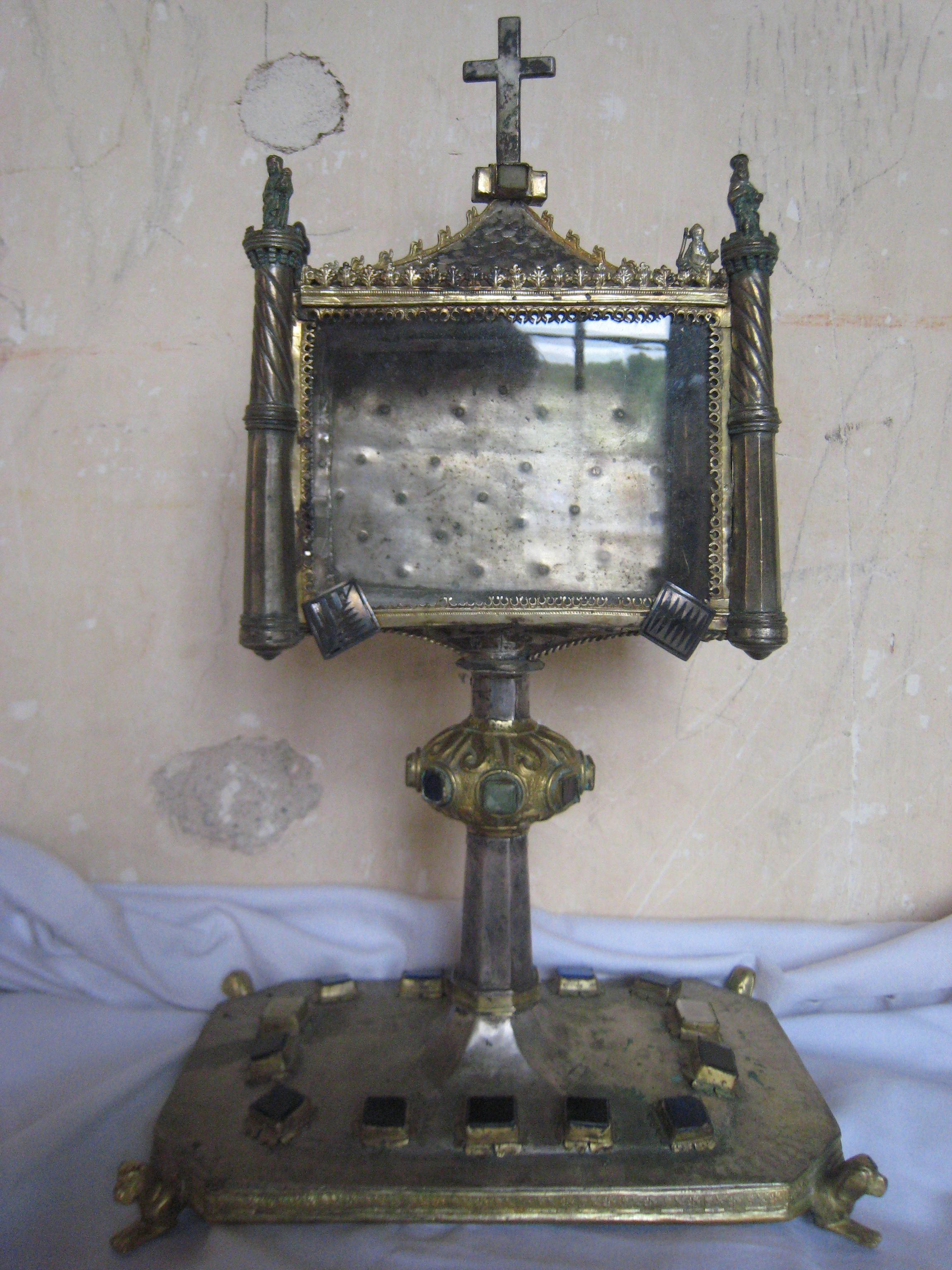Reliquaire en argent doré composé d'une base rectangulaire, d'une tige à noeud soutenant la boite architecturé. La base, ornée de 13 cabochons de verroterie sertis tout autour, repose sur quatre pieds en forme de chiens couchés. Une inscription gravée en lettres gothiques en fait le tour. La partie centrale se soulève pour maintenir le pied de forme octogonale. La tige octogonale est ornée d'un nœud en sphère aplatie à motifs de cabochons et entrelacs. La boîte architecturé est cantonnée de quatre colonnes moitié lisses et moitié torses, finissant en creneaux, et surmontées des statuettes de St Jean-Baptiste, St Claude, une Vierge à l'enfant et Ste-Catherine. La boite est surmonté d'un toit aux bordures de flammes dorées découpées etde fleurons sur les bords. Une croix horizontale est le départ d'une tige surmontée d'une croix. Trois cotés du reliquaire portent un décor d'étoiles rivées. Le devant du reliquaire est souligné d'une frise d'oves et de deux écussons (en forme de losanges émaillés portant l'un la bande fuselée des d'Aureille, l'autre un parti avec la même bande aux 1 et 3 chevrons au 2).