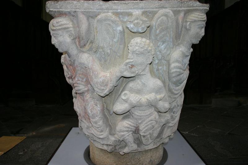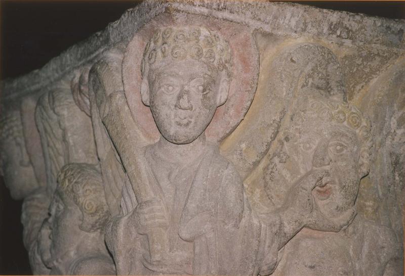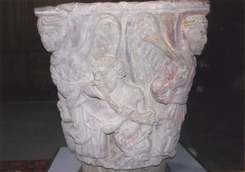 L'abbaye bénédictine est fondée au 7e siècle grâce à Calmin, duc d'Aquitaine, agrégée à Cluny en 1095. L'église primitive fondée en 700 a été remplacée par une église romane au 12e siècle et remaniée au 15e siècle. Ce chapiteau a été trouvé en 1983 par le curé, car il avait été utilisé comme pierre à bâtir par les restaurateurs du 15e siècle et placé dans le mur du choeur côté sud. Il faisait partie des huit chapiteaux du choeur roman détruit, dont cinq ont été retrouvés. Un est conservé à Londres, un autre a pour thème les Saintes Femmes au tombeau, un représente des Atlantes et le quatrième se trouve au musée lapidaire. Celui qui est classé en 2008 est le cinquième. Le logis abbatial vient d'être acquis par la commune.