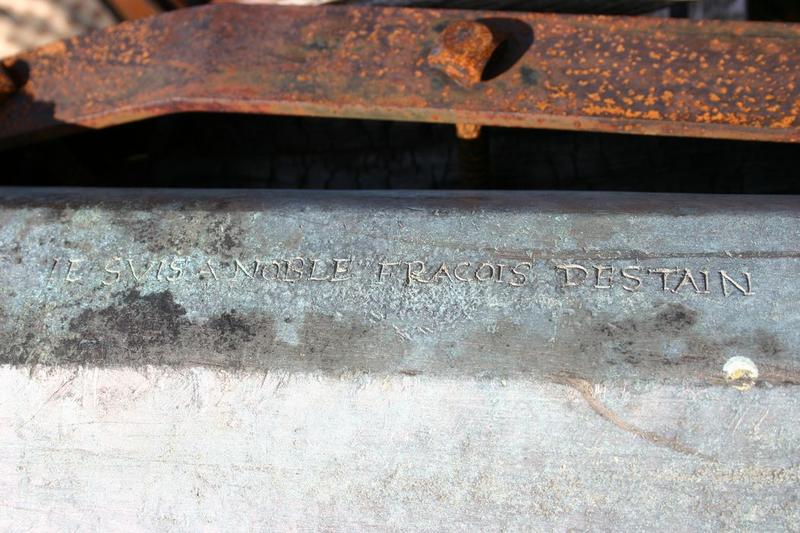 Au-dessus de la culasse : blason ovale aux armes des Estaing entouré du collier de l'ordre de saint Michel, timbré d'un heaume surmonté de trois plumes. Trois inscriptions gravées : trou de la mèche : 'datation 1574' ; sur le tube partie octogonale 'Je suis à NOBLE FRACOIS [sic] DESTAIN' ; sur la bague octogonale du tube 'JEHANJOLI/FONDEUR/MA FAICT'.