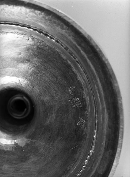 Lettre A avec deux palmes entrelacées couronnées, décharge : tête de renard, godron, feuilles d'eau, perles. Patène : IHS crucifère.