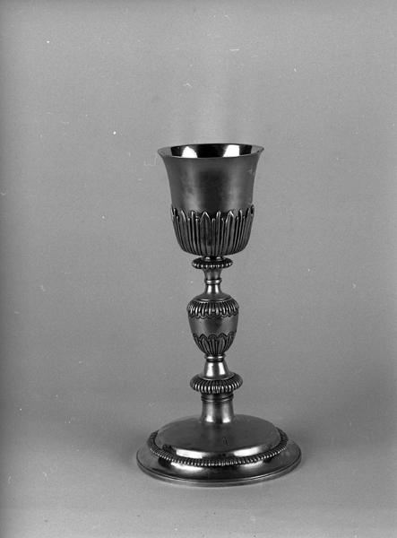 Dimensions du calice : h = 26,5, d = 14, diam de la coupe = 8,8 ; patène diam = 14,5, h = 0,7