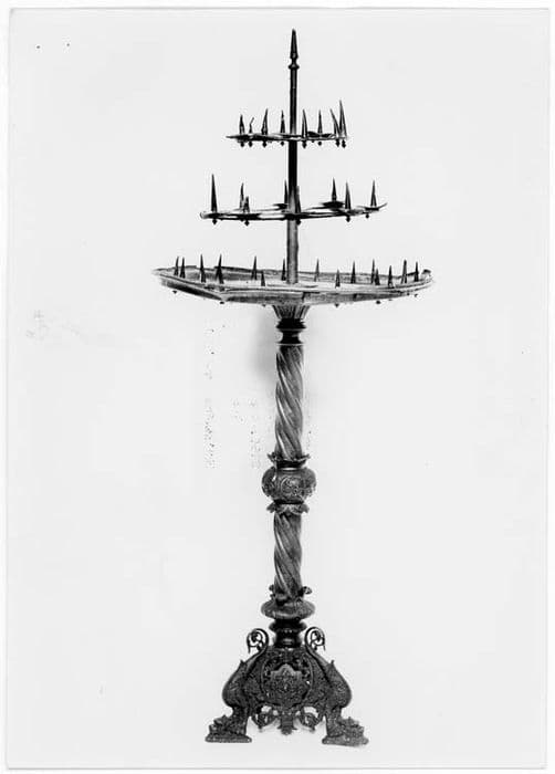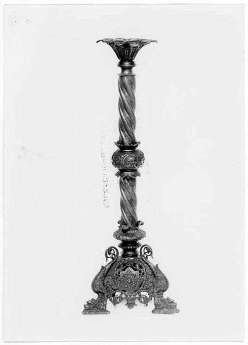 Trois chimères avec têtes écrasées contre le sol servent de pieds à la base triangulaire. Le fût torsadé est divisé en son milieu par un noeud entre deux collerettes festonnées. Une coupe évasée reçoit le premier plateau du porte-cierges qui est à trois étages en retrait les uns par rapport aux autres.