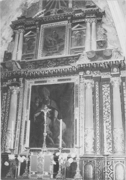 autel, tabernacle, croix et 6 chandeliers d'autel, retable, tableau d'autel : saint Ambroise évêque, et 3 tableaux : la Vierge de l'Apocalypse, saint Laurent et sainte Catherine d'Alexandrie (maître-autel)