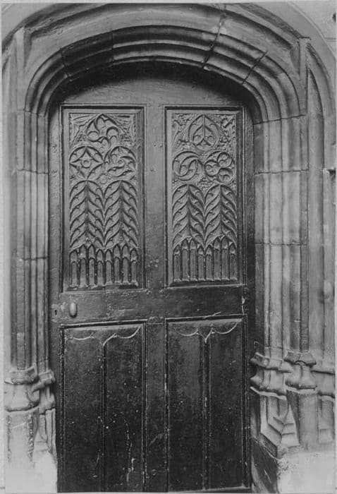 Vantail divisé en quatre panneaux rectangulaires. Il garnit encore l'élégante porte en anse de panier pour laquelle il a été fait.