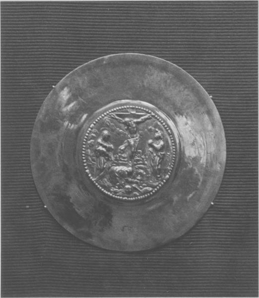 Sur la patène, Christ en croix, Saint Jean, Vierge et Marie-Madeleine.
