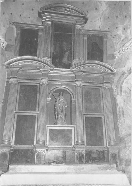 autel, retable, 15 tableaux : sainte avec personnages, corps de la sainte emporté au ciel par les anges (le), tête d'angelot, père éternel (le), Vierge (la), religieux au pied du Christ (des), statue : sainte martyre