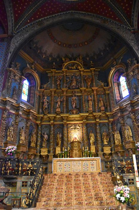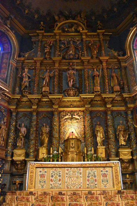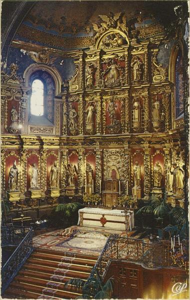 Retable de style espagnol occupant tout le fond du choeur. Tous les parements du retable ainsi que les éléments suclptés sont en noyer de bonne qualité.