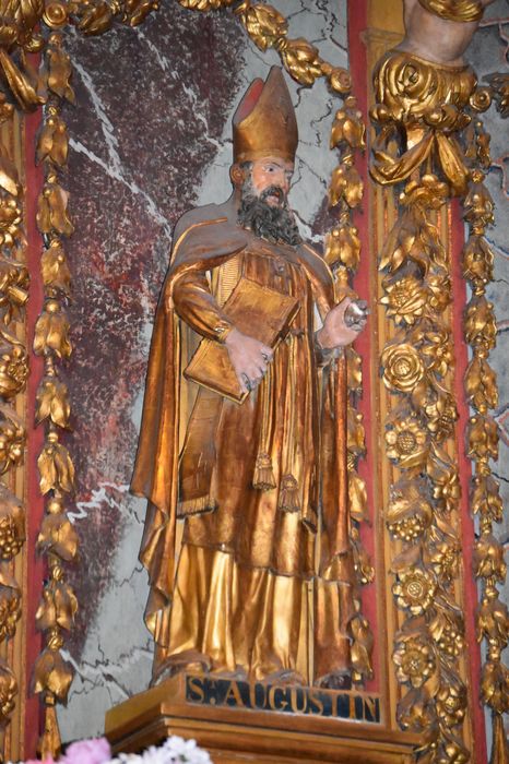 Il à quatre étages principaux de statues représentant des saints particulièrement vénérés dans la région. Ce sont, de gauche à droite, face à l'autel : au premier étage, Saint Augustin, Saint Etienne, Saint Fabien, l'ange Gabriel, la Vierge Marie, le tabernacle, Saint Joseph, Saint Pierre, Saint Léon, Saint Antoine de Padoue, Saint Roch, au deuxième étage, Saint Louis, Saint François-Xavier, Saint Jean-Baptiste, patron de l'église, Saint Laurent, Sainte Jeanne et à l'extérieur des fenêtres Saint Joseph (à gauche) et Sainte Catherine (à droite), au troisième étage, l'Assomption, entre deux évangélistes, au quatrième étage, le Père éternel, surmonté d'un pélican symbolique se déchirant le sein, entre deux anges.
