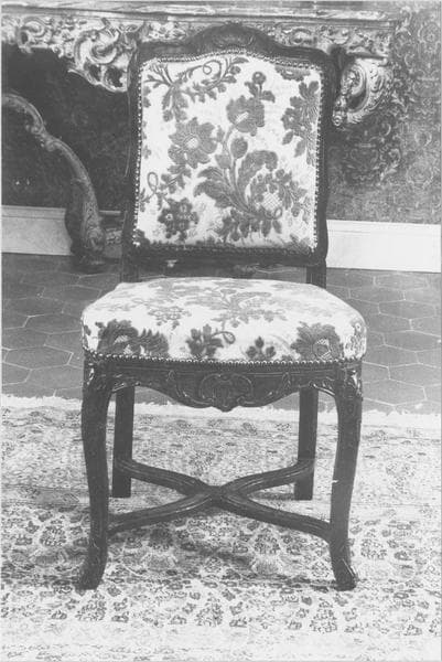 N° 35. Chaise en bois naturel, sculptée de moulures, pieds cambrés réunis par une entretoise.