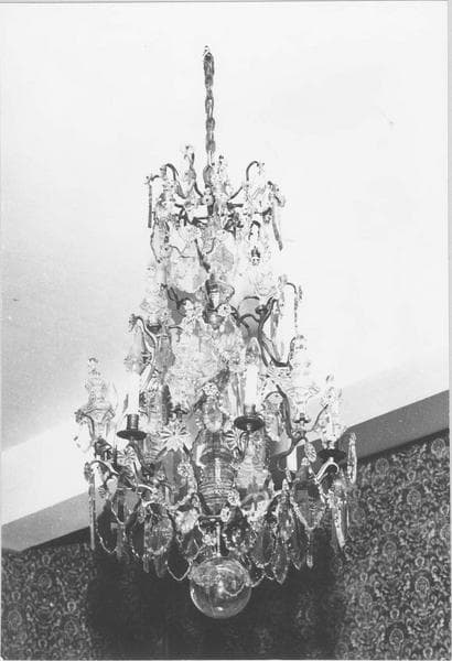 N° 39. Lustre à trois étages, le premier à douze branches de lumières, à plaquettes, poignards et rosaces.