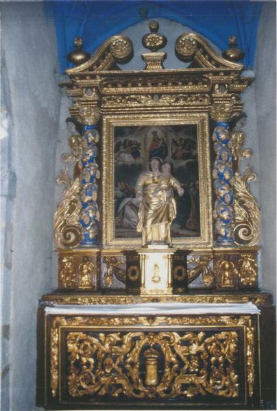 Autel retable tabernacle sans la Vierge, inscrite à l'inventaire supplémentaire le 13 janvier 1978. Au centre dans un cadre sculpté.