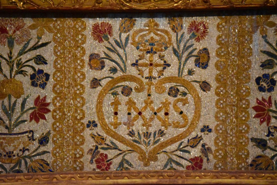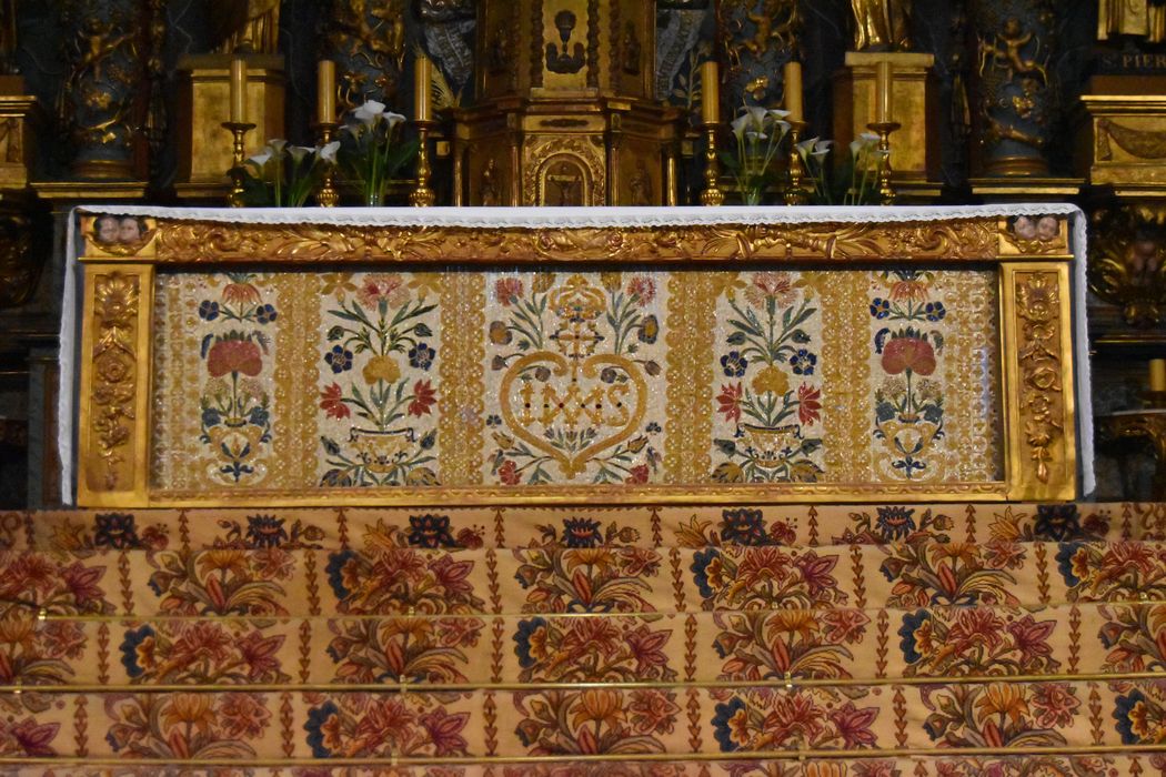 Parement d'autel en broderie de fils de soie et de perles de verres coloré.