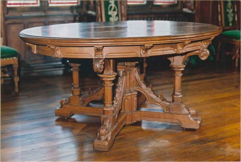 Table avec plateau ovale en marqueterie. Piétement : fût central se subdivisant en quatre en colonnes polygonales à chapiteaux. Les entretoises reprennent un motif d'arc boutant. Structure en chêne clair sculpté. Marqueterie d'essence non identifiée. Les rallonges de la table sont postérieures.