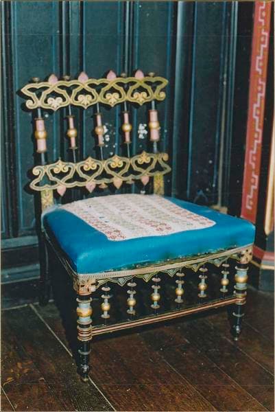 bois : peint, doré, tourné ; coton : brodé ; soie