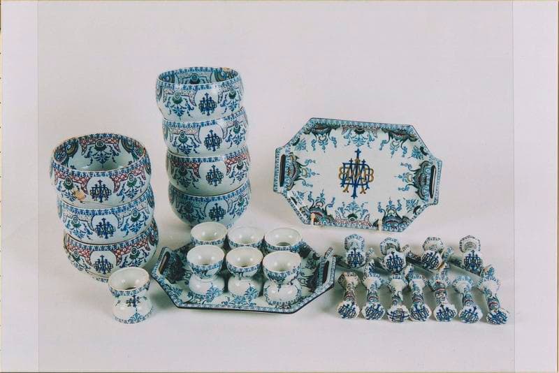 assiette (81) ; soupière ; plat (3) ; saladier ; saucière ; couvre-plat (8) ; jatte (7) ; coquetier (7) ; ravier (2) ; porte-couteau (15) ; sucrier (2) ; pichet (3) ; pot à lait de déjeuner (2) ; bol à thé ; soucoupe (4) ; tasse (5) ; gobelet
