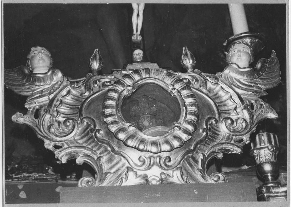 Reliquaire en bois sculpté, doré et peint, surmontant le tabernacle du maître-autel.