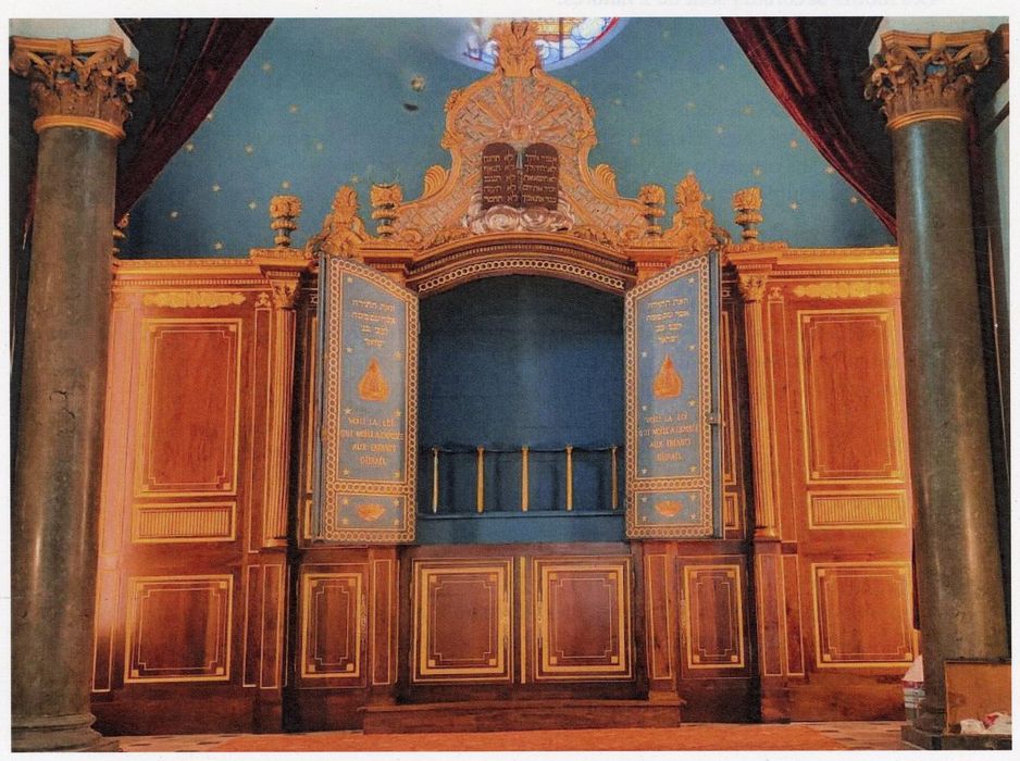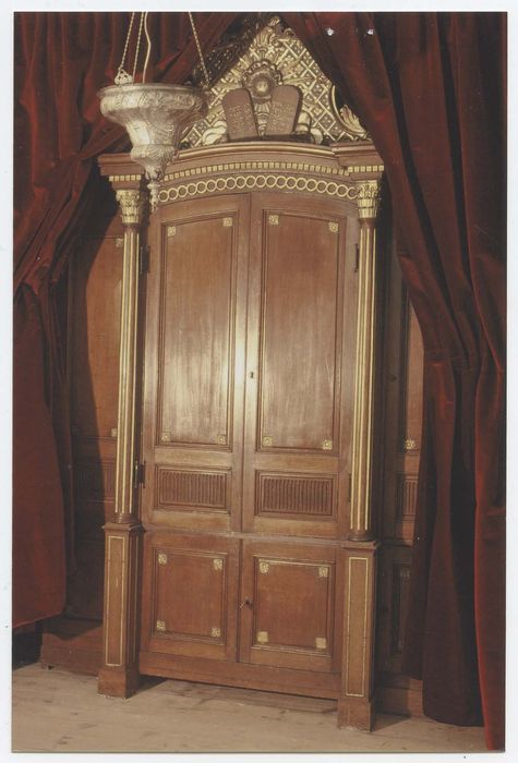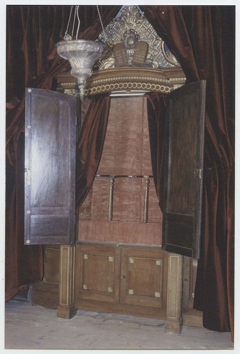 Arche sainte dite aussi arone aqodèche (ou encore : aron ha-qodesh) : intérieur peint compartimenté pour trois Torah, en bois de chêne verni, comportant de la dorure au décor de la partie haute et aux cannelures des colonnes latérales.