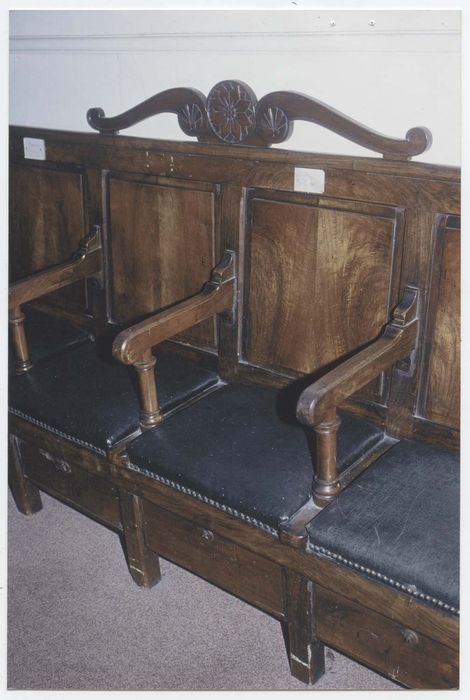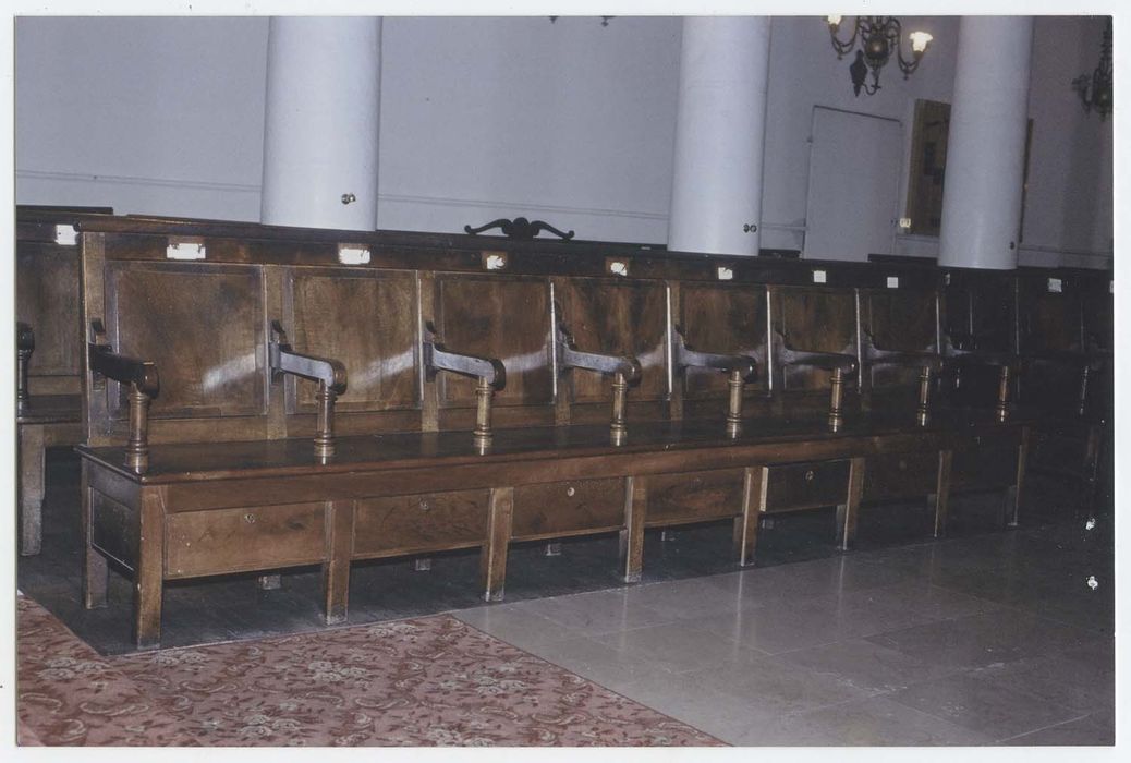 Ensemble de sièges en bois ciré comprenant : bancs du consistoire, bancs de la bienfaisance, bancs des endeuillés (bancs des abelims) et bancs des fidèles. Il y a au total: huit bancs à sept assises, deux bancs à six assises, un banc à cinq assises, deux bancs à quatre assises et un banc à trois assises. Alvéoles ouvrant par l'avant.