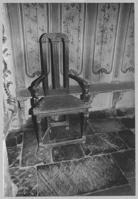 Fauteuil de style 15e siècle, sans garniture. Dossier formé de deux arcades étroites.