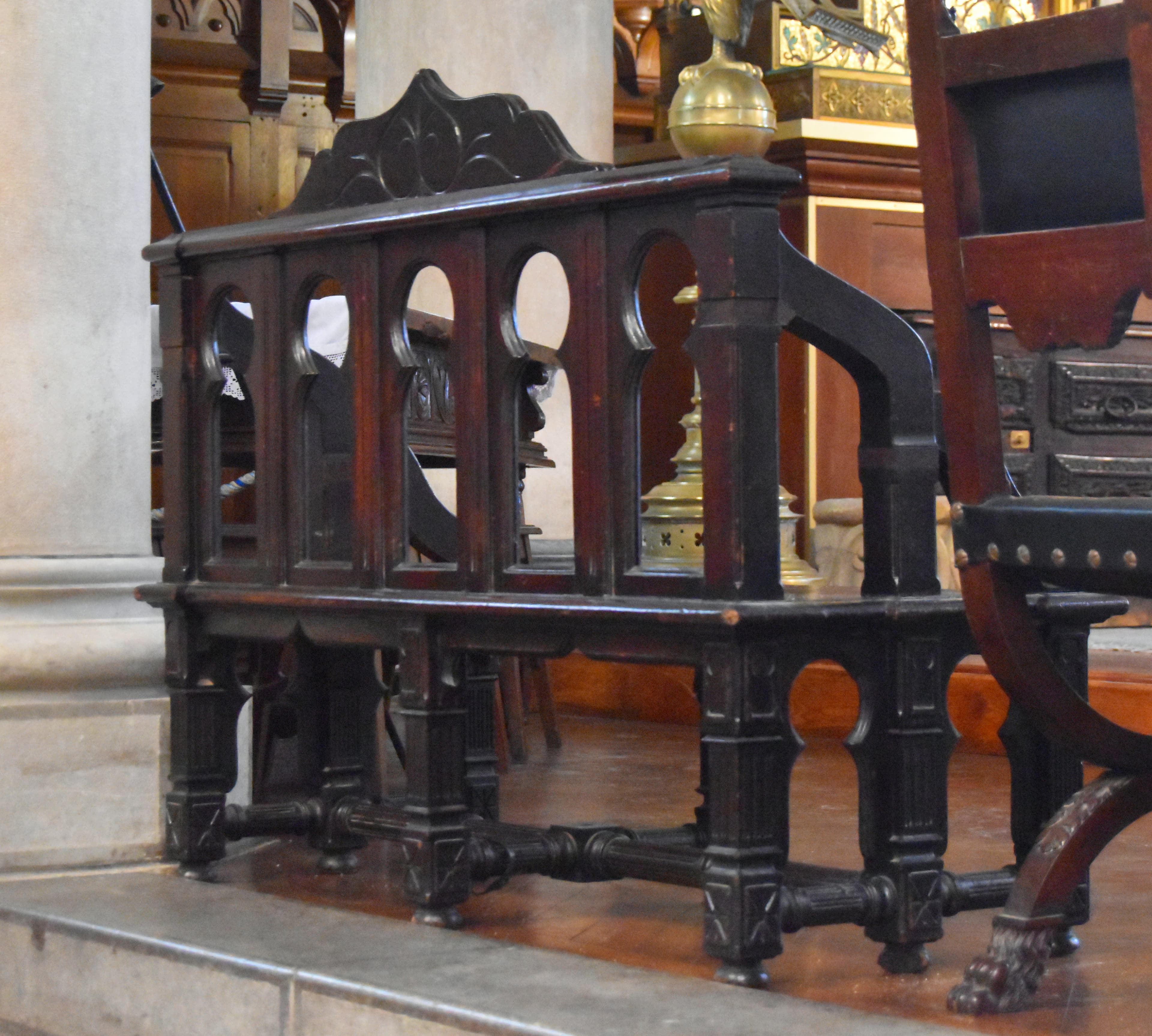 Bancs avec agenouilloirs, les montants des extrémités formant piétements, se terminent en fleurs de lys.