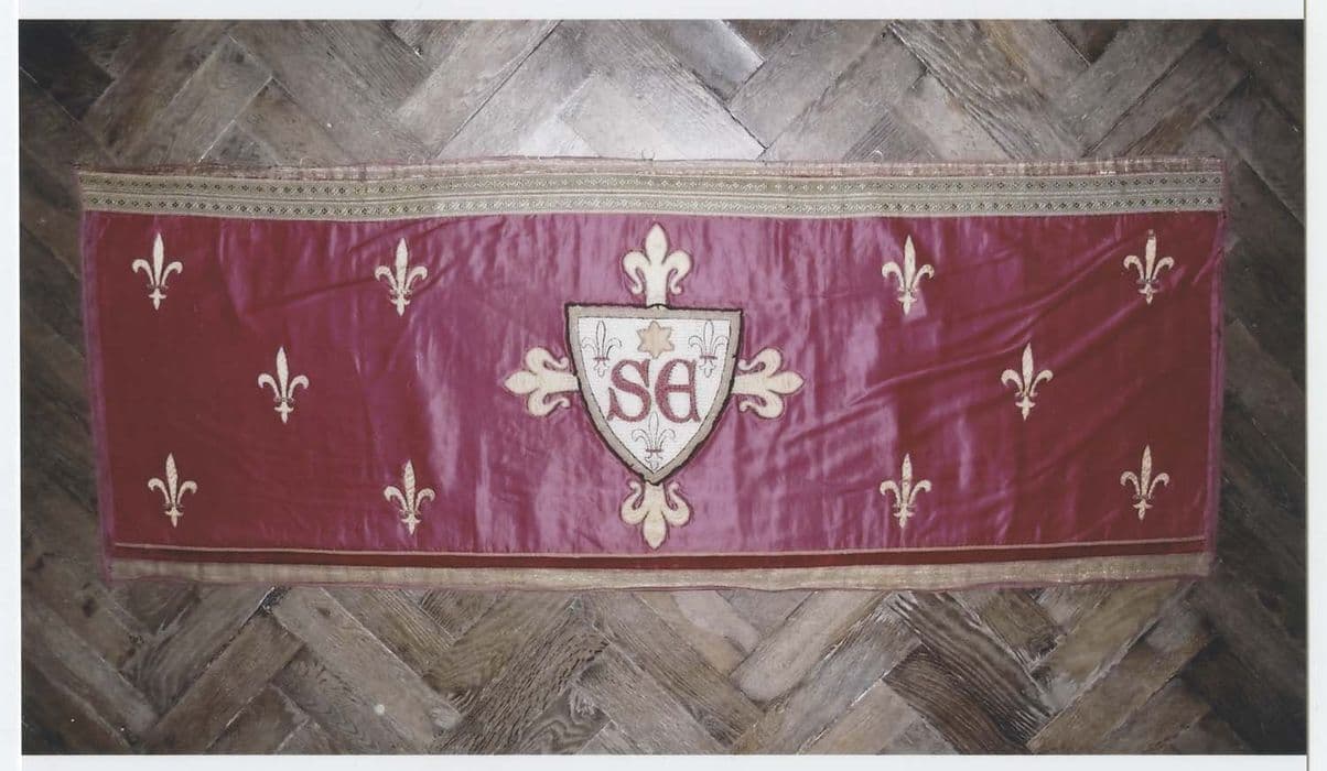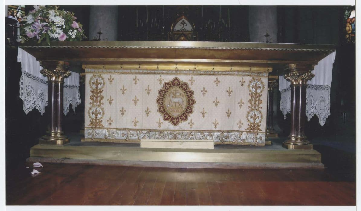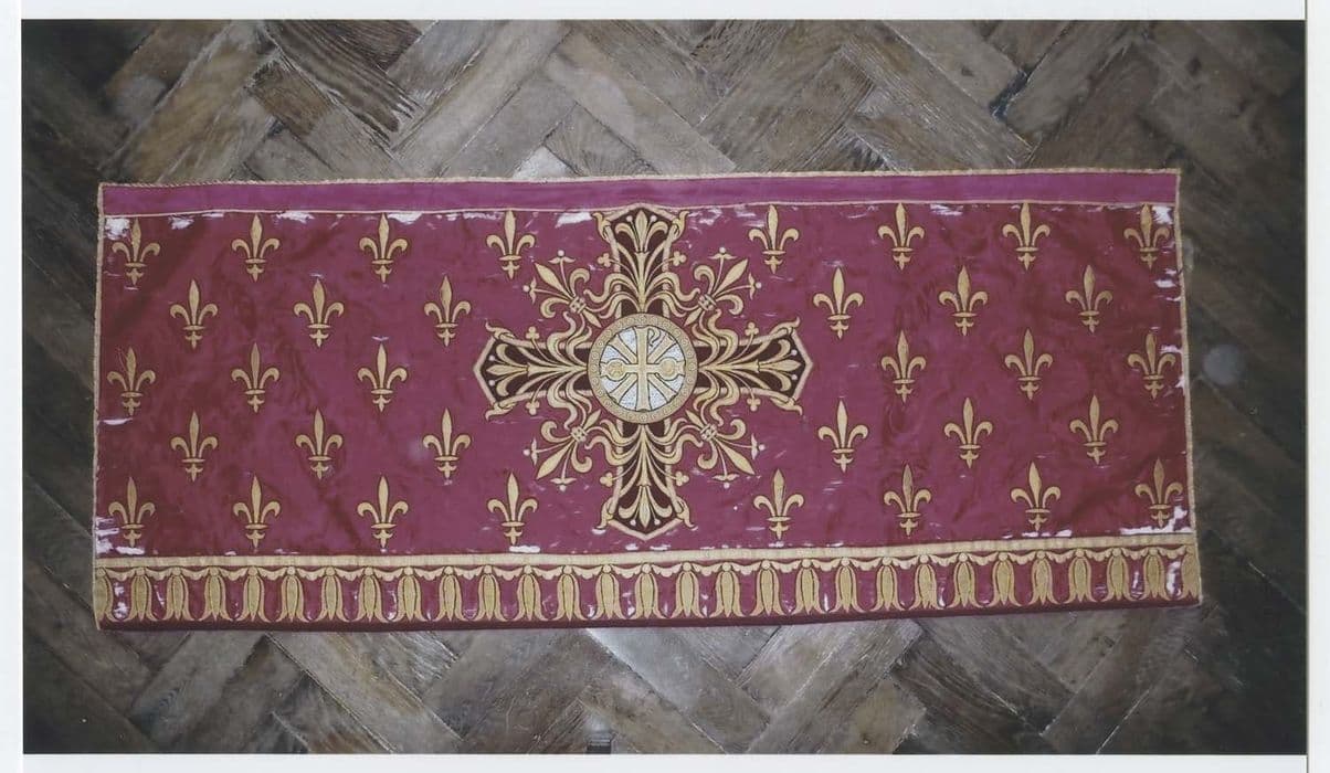 Premier antependium : pékin de soie rosé semé de fleurs de lys brodées - au centre, l'agneau dans une mandorle fleurdelisée - au bas, frise de colombes sur fond de satin de soie ciel. Broderie au fil de soie, cabochons métalliques. Deuxième antependium : satin de soie rouge semé de fleurs de lys brodées au fil d'or - au centre, SE et l'étoile des armes de l'église Sainte-Eugénie. Broderies de fils de soie et fils d'or. Troisième antependium : soie rouge semée de fleurs de lys - au centre, au cœur d'une croix de velours rouge appliquée, doublement fleurdelisée, l'alpha et l'oméga. Broderie appliquée, fil de soie, cabochons métalliques. Quatrième antependium : soie violette, croix de Malte fleurdelisée, épées entrecroisées, alpha et oméga ; à la frise inférieure inscription. Broderie appliquée.