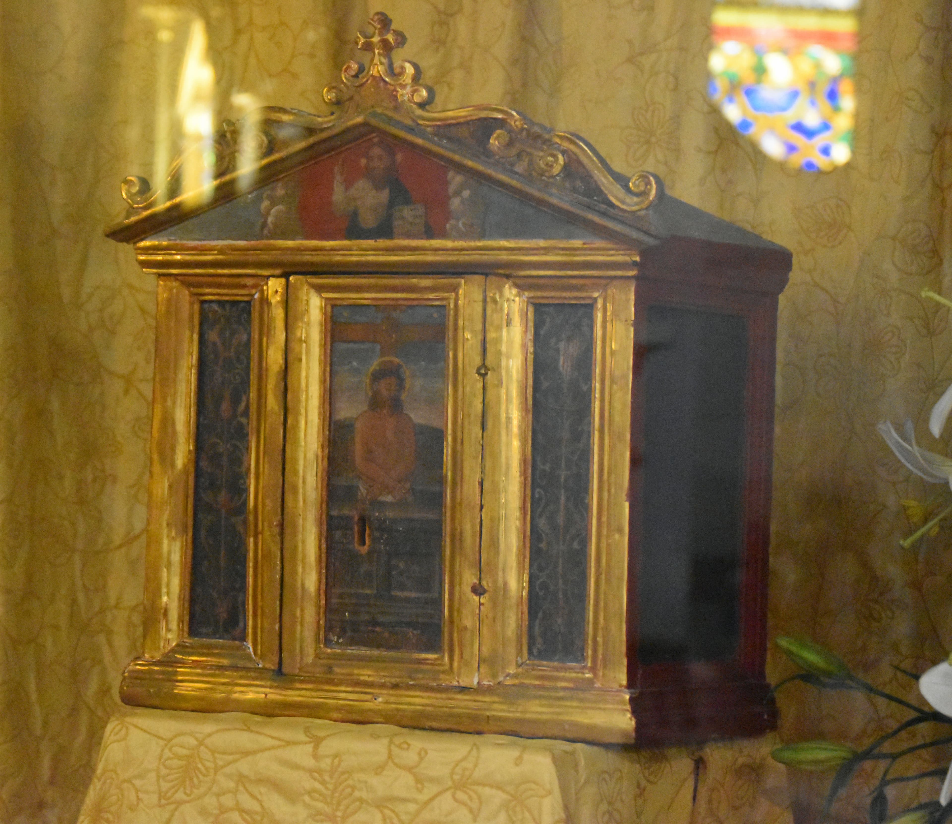 Au fronton, deux ailerons à volutes rentrantes encadrent une croix. A la porte, Christ aux liens adossé à la Croix.