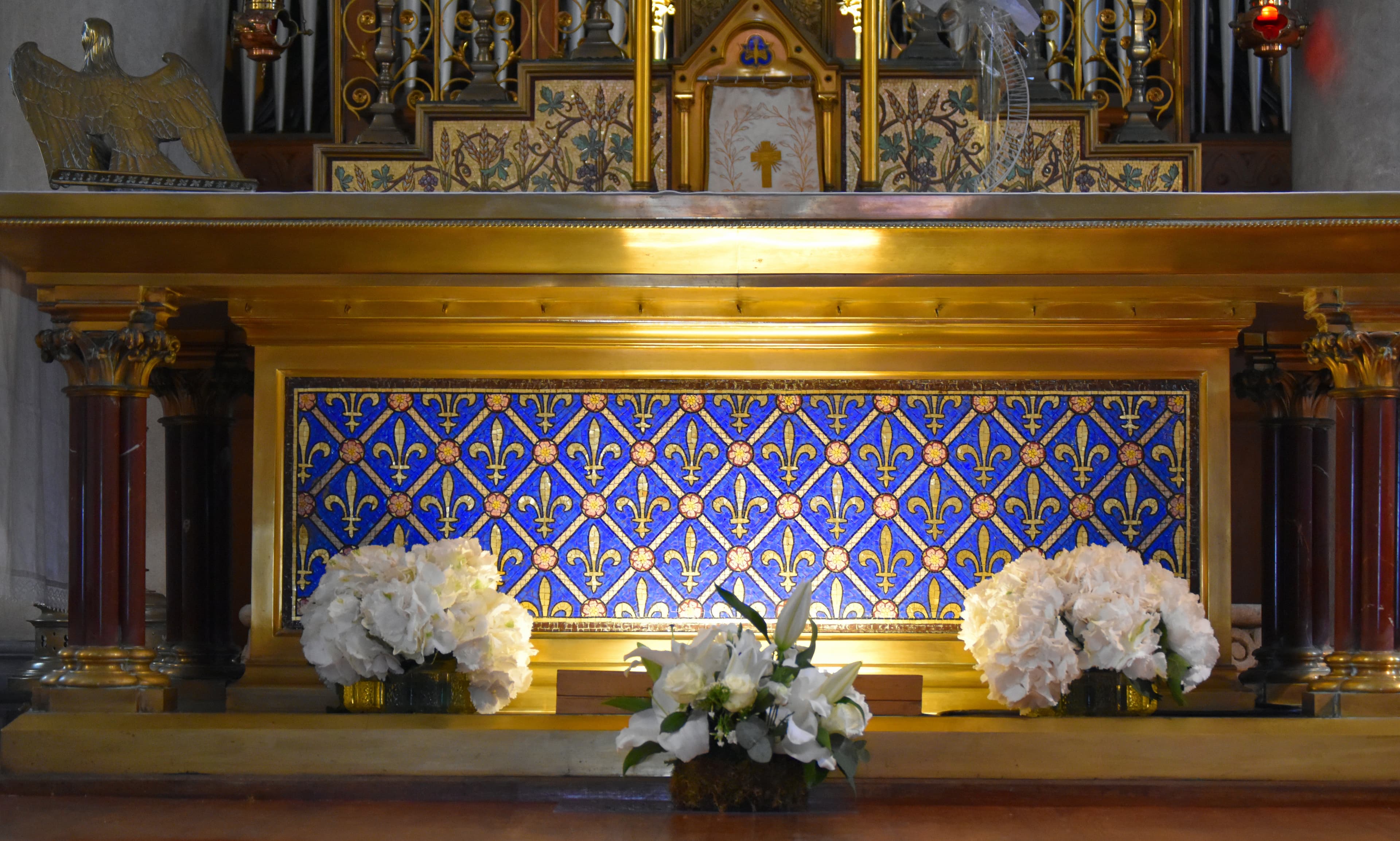Table d'autel en marbre blanc sur quatre double colonnes de marbre foncé posées sur un bloc de maçonnerie. Les quatre faces revêtues de mosaïques sont cernées de laiton.