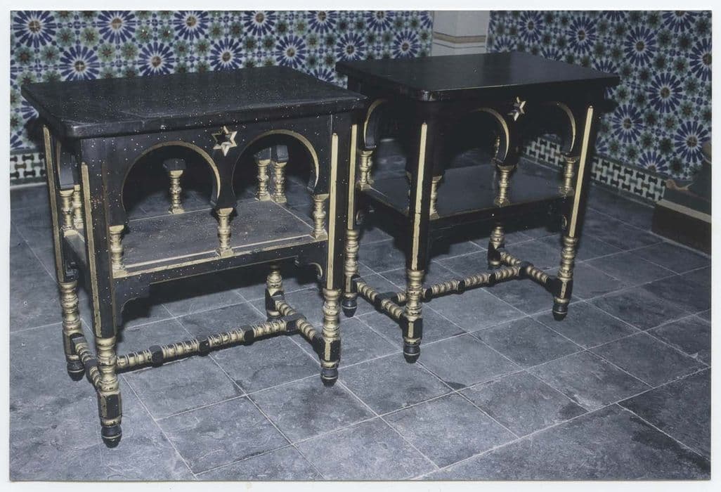 Deux petites tables de style mauresque, avec plateau d'entrejambe surmonté de deux arcs sur chacun des grands côtés et d'un seul arc sur chacun des petits côtés. Piétement à entretoise tournée. Bois noirci tourné, piétement en partie doré.