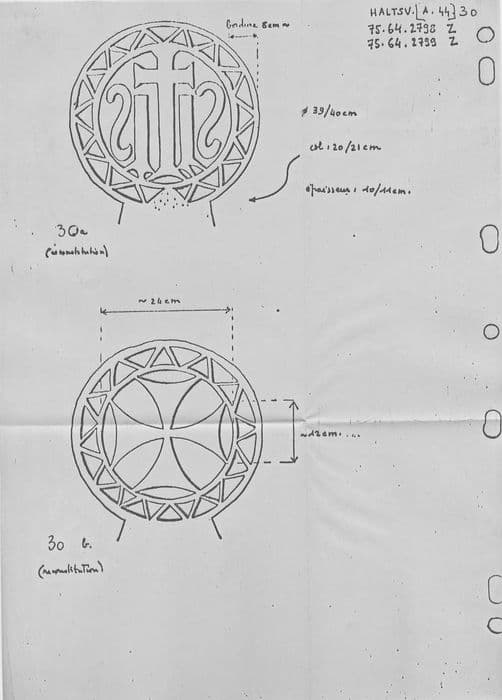 six croix : numéros 37, 38, 39, 40, 63, 53 sur le plan ; linteaux : n°64 sur le plan ; neuf stèles discoïdales : numéros 8, 9, 11, 20, 26, 30, 42, 43, 45 sur le plan ; cinq stèles tabulaires : numéros 19, 27, 29, 34, 47 sur le plan