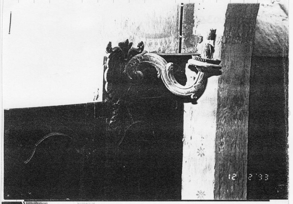 Deux bras de lumière avec platine d'applique en châtaignier ou bois blanc sculpté, clouée sur le lambris.