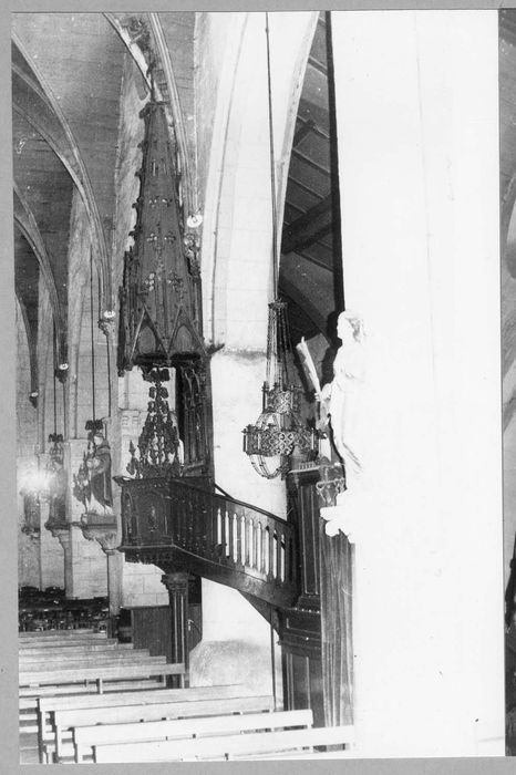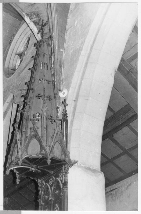 Chaire à prêcher de style néo-gothique, fixe, adossée, portée par un pied formé d'un faisceau de quatre colonnettes ; l'escalier débouche dans le bas-côté. Des bas-reliefs en bois doré sont rapportés sur la cuve et le dorsal ; l'abat-voix est en forme de flèche.