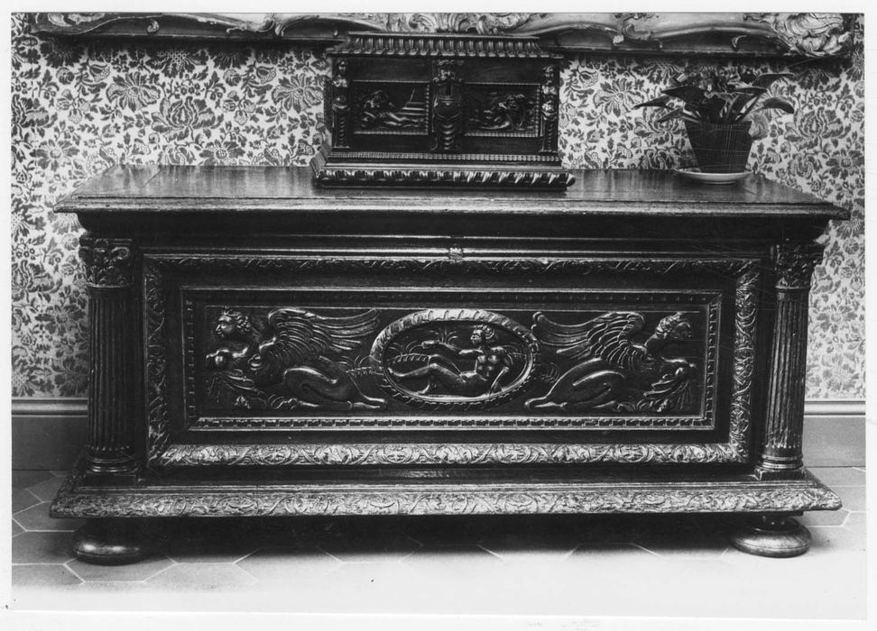 Décor de chimères avec une femme nue dans un ovale. Le coffre est également bordé aux extrémités de deux semi-colonnes à fût cannelé et chapiteau composite.