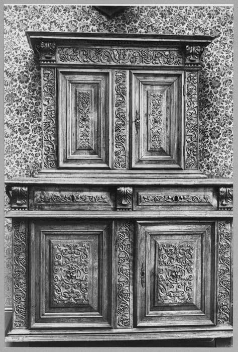Meuble buffet en bois naturel, à deux corps ouvrant à quatre vantaux et deux tiroirs, sculpté de guirlandes composées de pampres de vigne et de grenades.