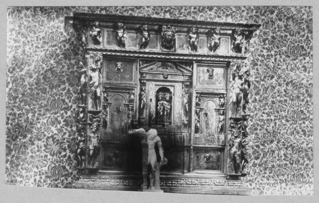 Meuble cabinet en bois naturel, avec montants ornés de cariatides à registres superposés, surmonté d'une corniche à angelots. Au registre inférieur, entre les montants, décor architecturé avec : en patie médiane, niche encadrée par deux cariatides et surmontée d'un fronton triangulaire ; de part et d'autre, deux autres niches et leurs cariatides, surmontées de panneaux pleins avec en leur centre, des mascarons.