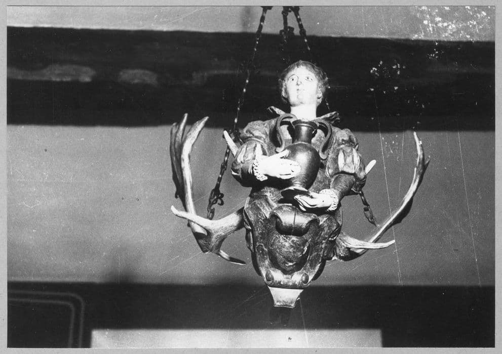 Elément sculpté, suspend, en forme de sirène supportant un vase, avec des bois d'élan et armoiries.