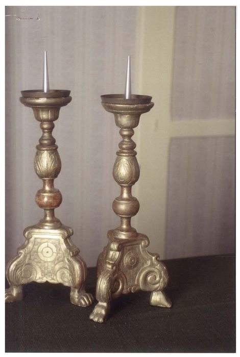 Quatre chandeliers du maître-autel en bois sculpté (doré pour les chandeliers du maître-autel, peint pour ceux conservés au presbytère).